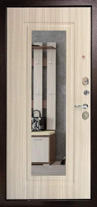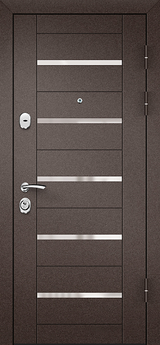Прочный стальной каркас, лист металла толщиной 2 мм и система блокираторов делают эту модель надежным барьером для квартиры, офиса или частного дома. Внешняя поверхность покрыта молотковым напылением, устойчивым к механическим повреждениям и перепадам температуры, благодаря чему дверь сохраняет аккуратный вид долгие годы. Внутренняя накладка МДФ добавляет уюта и гармонично сочетается с интерьером прихожей. Зеркало на полотне выполняет не только декоративную функцию, но и делает пространство визуально шире. Зеленая входная дверь в квартиру №2 комплектуется двумя замками российских производителей — сувальдным Просам и цилиндровым Мосрентген, каждый из которых оснащён тремя ригелями. Два контура резинового уплотнения помогают минимизировать сквозняки и шум, а возможность выбрать сторону и тип открывания делает установку максимально удобной. При необходимости отделку, замки и дополнительные элементы можно адаптировать под индивидуальные требования. Зеленая входная дверь в квартиру №2 от производителя: быстрое изготовление и монтаж в Звенигороде, индивидуальные размеры, широкий выбор материалов и фурнитуры, официальная гарантия до 10 лет.